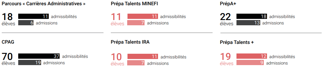 Grâce aux préparations, 100% des étudiant·e·s admissibles du parcours Carrières Administration et 100% des étudiants·e·s admissibles en Prep'ENA ont été admis à au moins un concours.